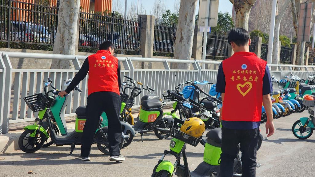 当日清晨,志愿者们早早集合在校门口,持扫帚、垃圾袋等清洁工具,深入校园各个角落。他们仔细清扫道路上的落叶、纸屑,清理花坛中的杂物,不放过任何一处卫生死角。面对摆放杂乱的共享单车与电动车,他们迅速行动起来。大家分工明确,有的负责将歪倒的单车扶起,有的按照车头方向一致的标准将车辆排列整齐。尽管校门口车流量较大,且部分车辆因长期停放而沾满灰尘,但志愿者们毫无怨言,经过一个多小时的努力,原本杂乱无章的单车摆放得井然有序,校门口面貌焕然一新。在清洁过程中,同学们纷纷对志愿者们的辛勤付出表示赞赏,并表示今后会更加注意保持校园环境。