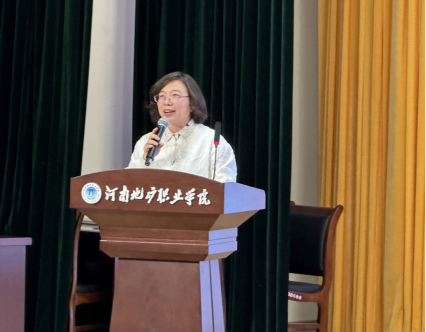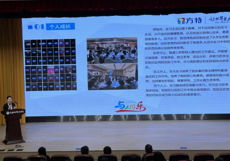 21级酒店管理与数字化运营1班员工代表张慧娜发言。张慧娜向同学们分享了自己的实习生活和感想,真实而又深刻,展示了心路历程和心态的转变,最后总结了工作经验。
