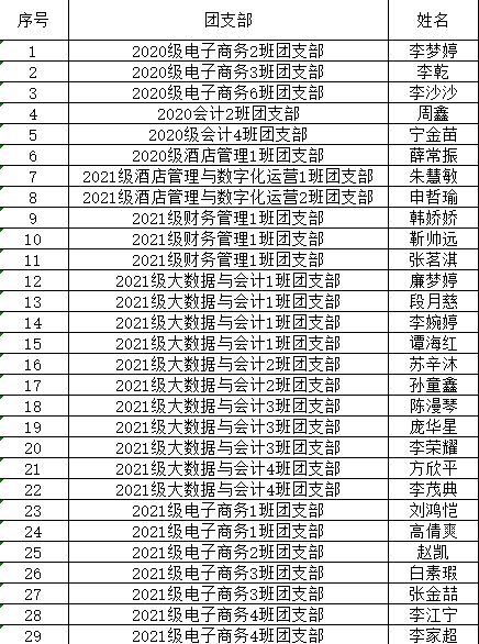为进一步激励申请入党团员在学习、工作、生活中发挥模范作用,推荐优秀团员作为入党积极分子,我系2020、2021级各团支部于2022年3月召开了支部大会,进行入党积极分子推优工作。根据“公平、公开、公正”的原则,经团支部推优、系团总支审核、并报校团委批准,现将各支部推优工作结果公示如下: