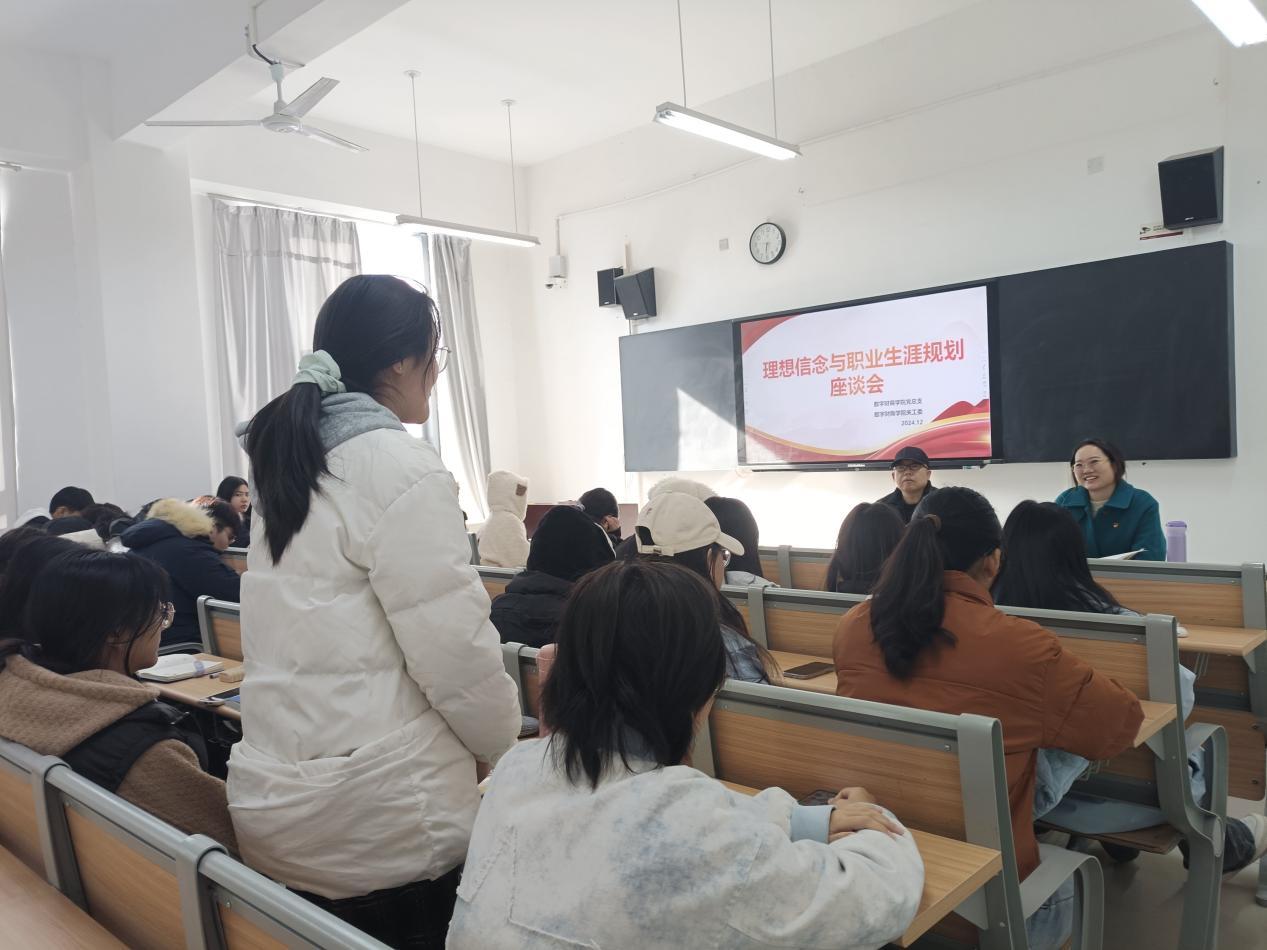 在座谈交流中,陈宇向同学们讲解了理想、信念及理想信念的丰富内涵,以及职业生涯的概念和职业生涯规划的步骤,引导同学们要从专业角度,坚定好理想信念,做好职业生涯规划;他还结合自己的工作经历,分享了他个人上学时的理想信念和职业生涯规划,以及面对内外因素发生变化时,应对原职业生涯规划进行适时调整。陈静分享了如何对自己的职业和生涯进行合理规划,详细介绍了自己从高职学历坚持不懈获取博士学历的历程。在交流中,他们还耐心回答了同学们的有关提问和疑惑,同学们发言踊跃,交流积极,许多同学根据所学专业畅谈了自己当前的理想与信念、对自己的职业生涯进行了短期、中期和长期规划。