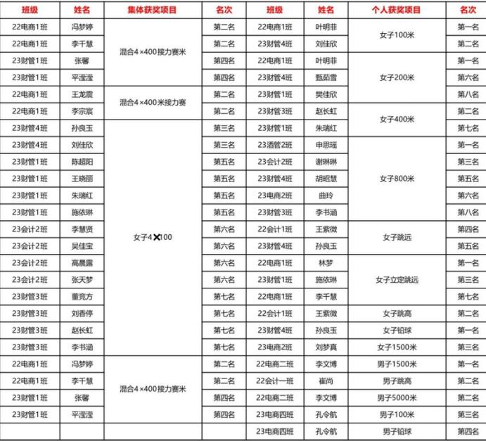 特别是22电子商务1班的叶明菲同学蝉联女子100米和女子200米冠军并保持运动会记录、23财管4班的孙良玉同学获女子铅球冠军并创运动会记录、23酒店管理2班的申思瑶同学获女子800米冠军、22电商1班的林梦同学获女子立定跳远冠军、22电商2班的李文博同学获男子1500米冠军并创运动会记录,还取得男子5000米第二名的佳绩!此外,23财管4班、22电商1班、23财管1班分别获得全校班级总分第3、6、7名的好成绩!