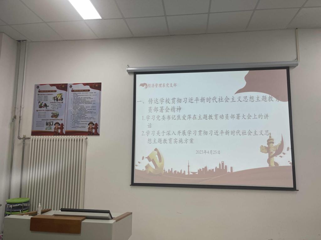 2023年4月25日下午14点。经济管理系党支部在系ERP实训室召开了学习贯彻习近平新时代中国特色社会主义思想主题教育动员部署会,党支部全体党员和全体教师参加了会议。