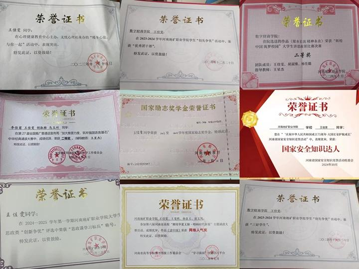 在实践中,王佳雯积极投身各类学科竞赛与创新创业赛事,累计斩获国家级证书5项、省级证书11项、校级证书23项;在志愿公益方面,她同样步履不停,先后参与河南春晚志愿服务、“返家乡”社会实践、“三下乡”暑期实践、校内志愿服务等多项活动,志愿时长累计达到800小时。